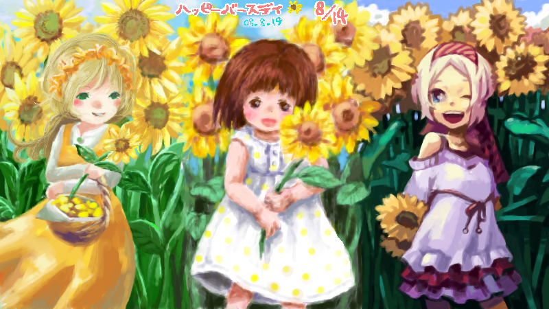 夏なので向日葵畑とワンピース娘です。左からluちゃん、自分、ゆきひこちゃん。クリックででかくなるはずです。